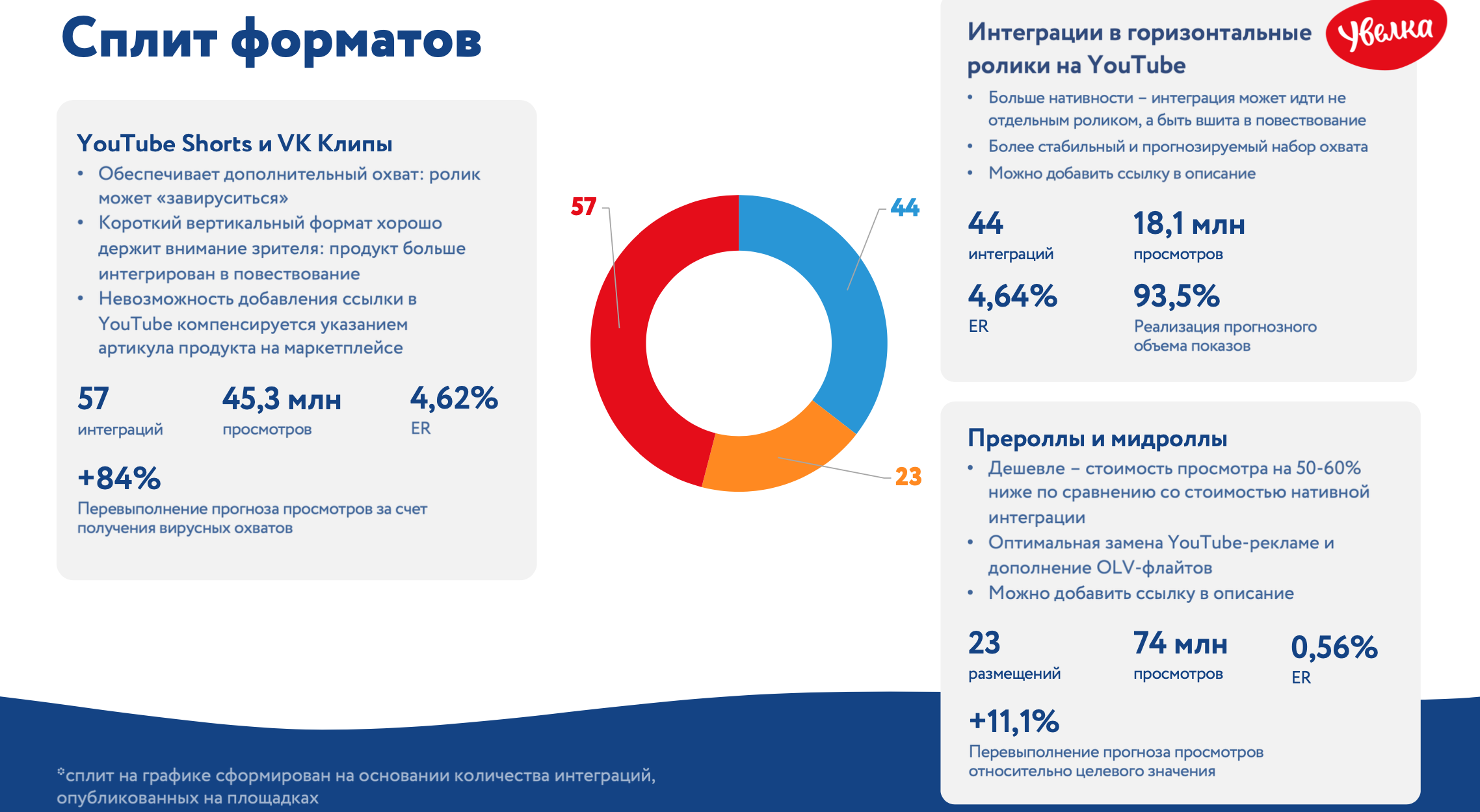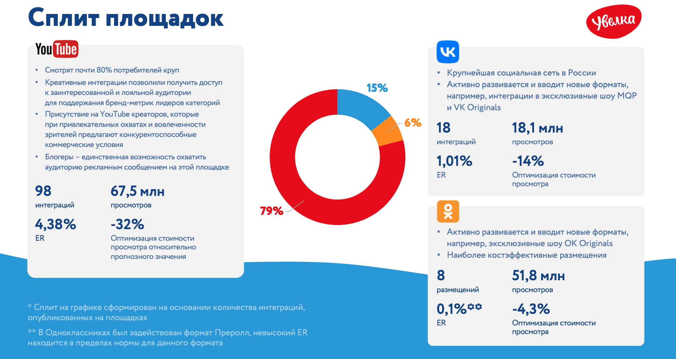 В дополнение к influencer- и OLV-кампаниям мы использовали популярный формат alter-roll. Мы разместили более 20 коротких вставок с видео о продукции «Увелка» в блогах на YouTube, в шоу VK и Одноклассниках. Один из роликов снял блогер, ранее участвовавший в кампании и показавший высокие результаты. Alter-roll — это эффективное дополнение к influencer-кампаниям, так как его стоимость на 50−60% ниже, чем у нативных интеграций. Этот формат отлично заменяет рекламу на YouTube и усиливает OLV-кампании.